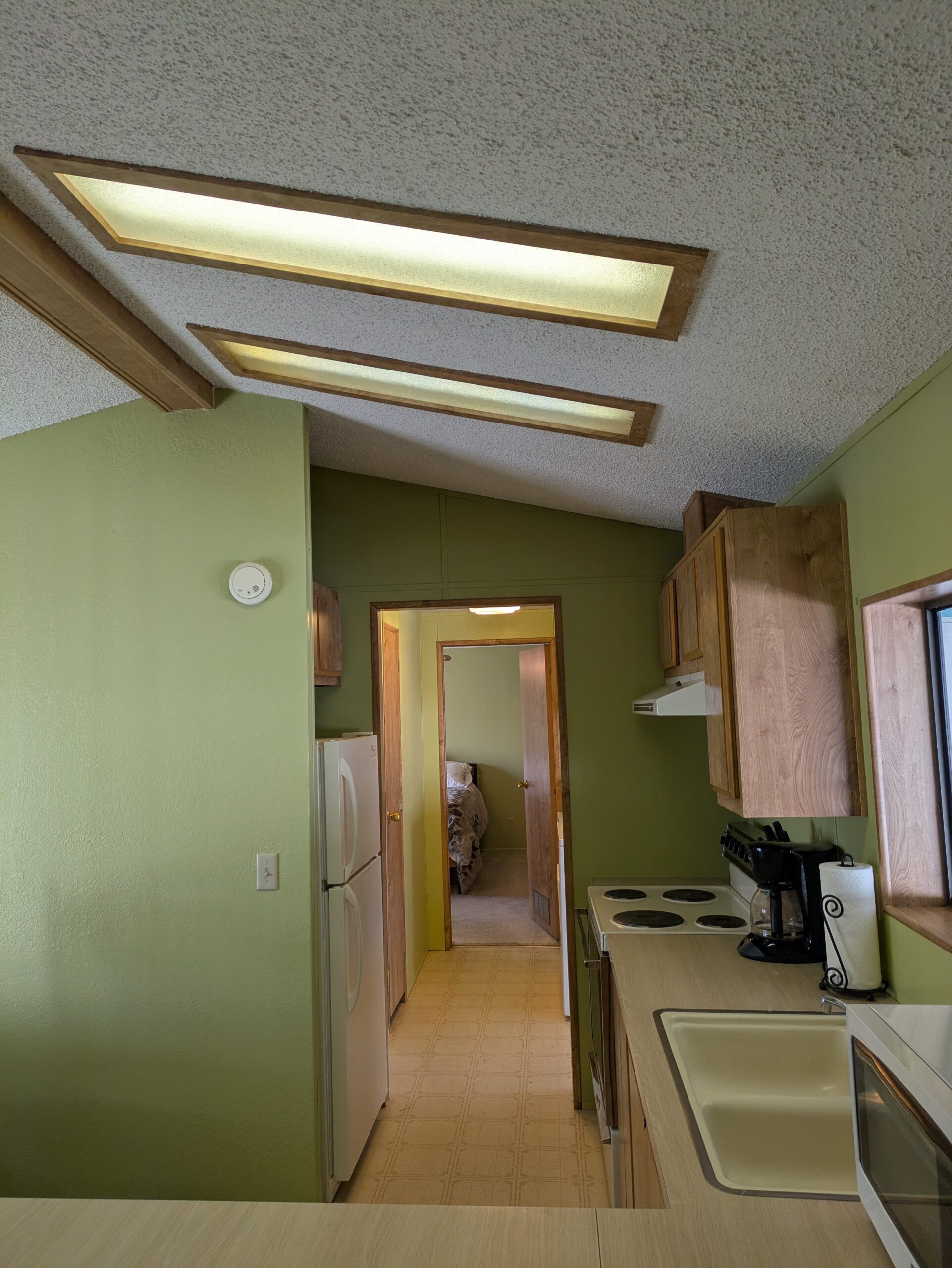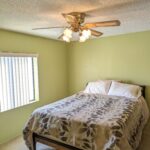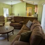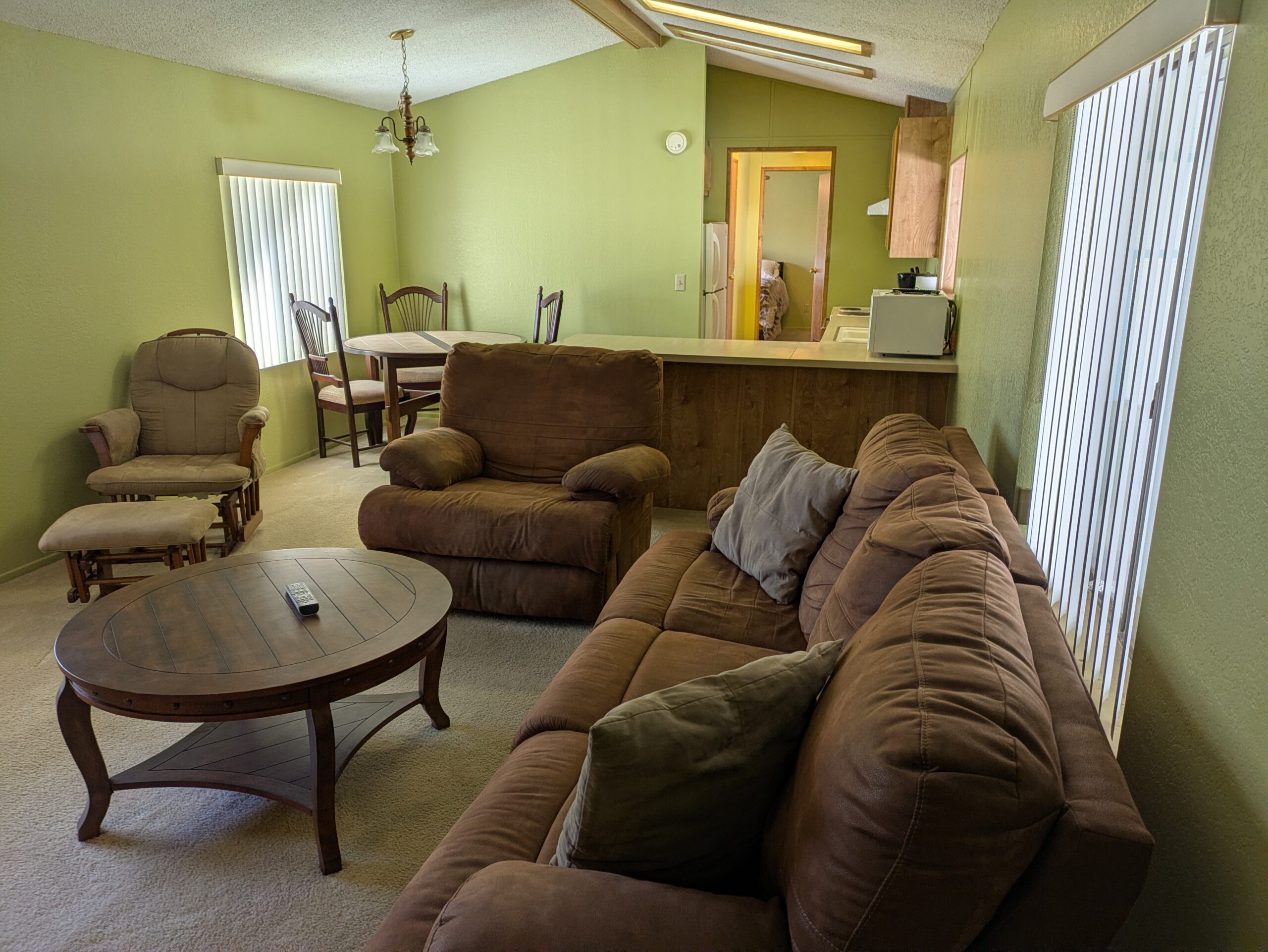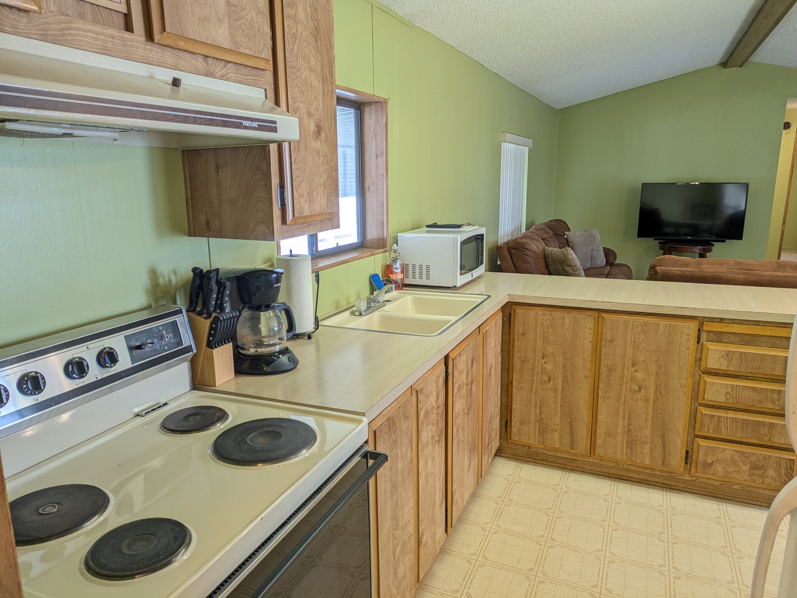 This home is being sold fully furnished and offers a comfortable open-concept layout that includes an eat-at bar with generous counter space, and a well-appointed kitchen featuring a GE refrigerator, GE electric range, and microwave, there is even space for a dining table. The thoughtful split-bedroom floor plan provides added privacy, with the primary bedroom offering an en-suite bath with a walk-in shower, ceiling fan, and direct access to the utility room, while the secondary bedroom also includes a ceiling fan and convenient access to the hall bath with a tub/shower combination.